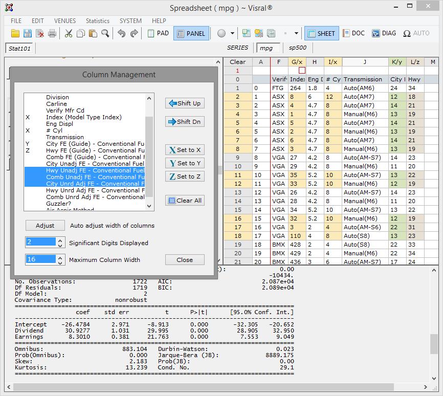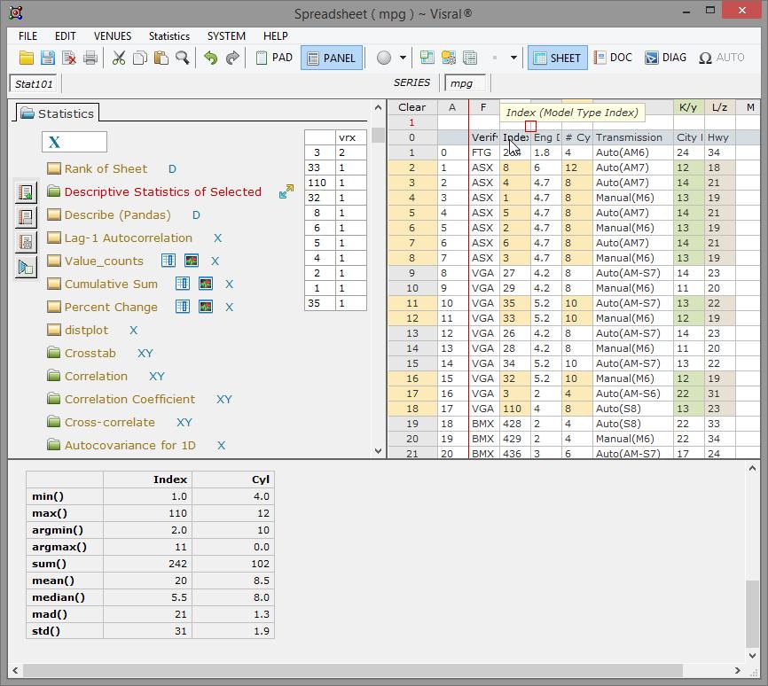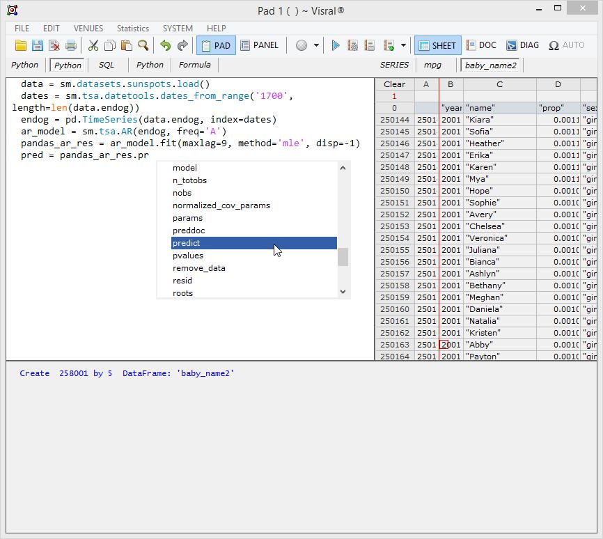 5. With a click of a button on any combination of columns and rows, including non-contiguous, or by dragging the mouse, make selections for creating new DataFrames, Series, arrays, matrices, or list, for printing tables in documents, or for feeding Python operations.