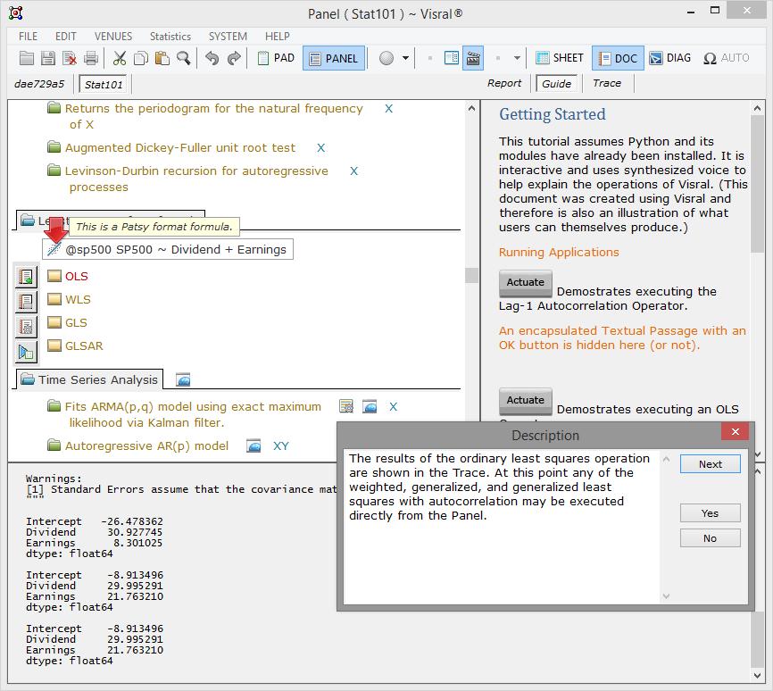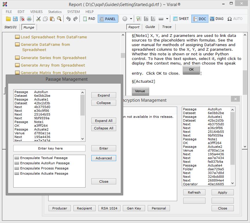 8. The Report document accepts results from Python operations, including images, plots, and charts. The code producing those results can be hidden in the document as an Execute button to be executed later from the Guide; perhaps when dependent data is available. It can also be hidden as Operator button to be recalled to a Panel for subsequent user configuration.
