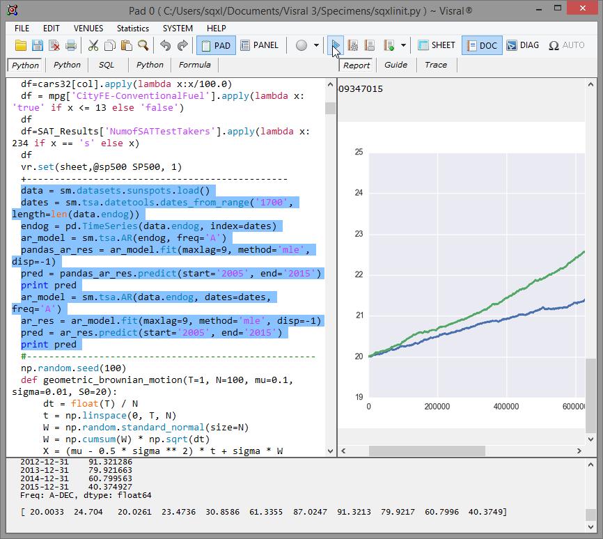 8. The actual Python engines run in processes separate from the editors, meaning if some experimental code caused it to hang, say in an endless loop, all is not lost. Python can be restarted from within SQXL, preventing the loss of work and permitting a modified version of the culprit code to be tried again.
